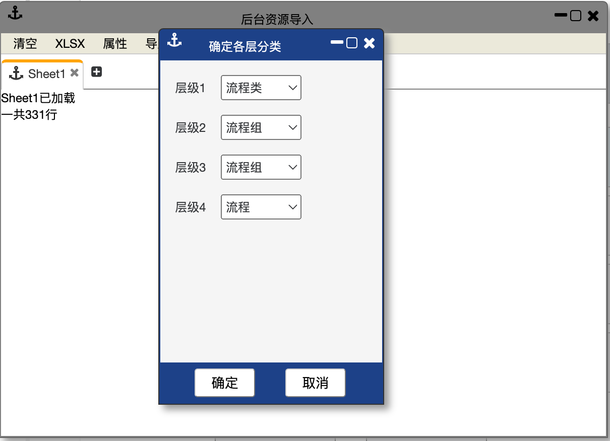 在弹出的窗口中,选择各层级流程的类别,然后点击确认即可开始上传。(procepool默认流程层级数为四层,建议,第一层为流程类,最后一层为流程,中间层级为流程组。)