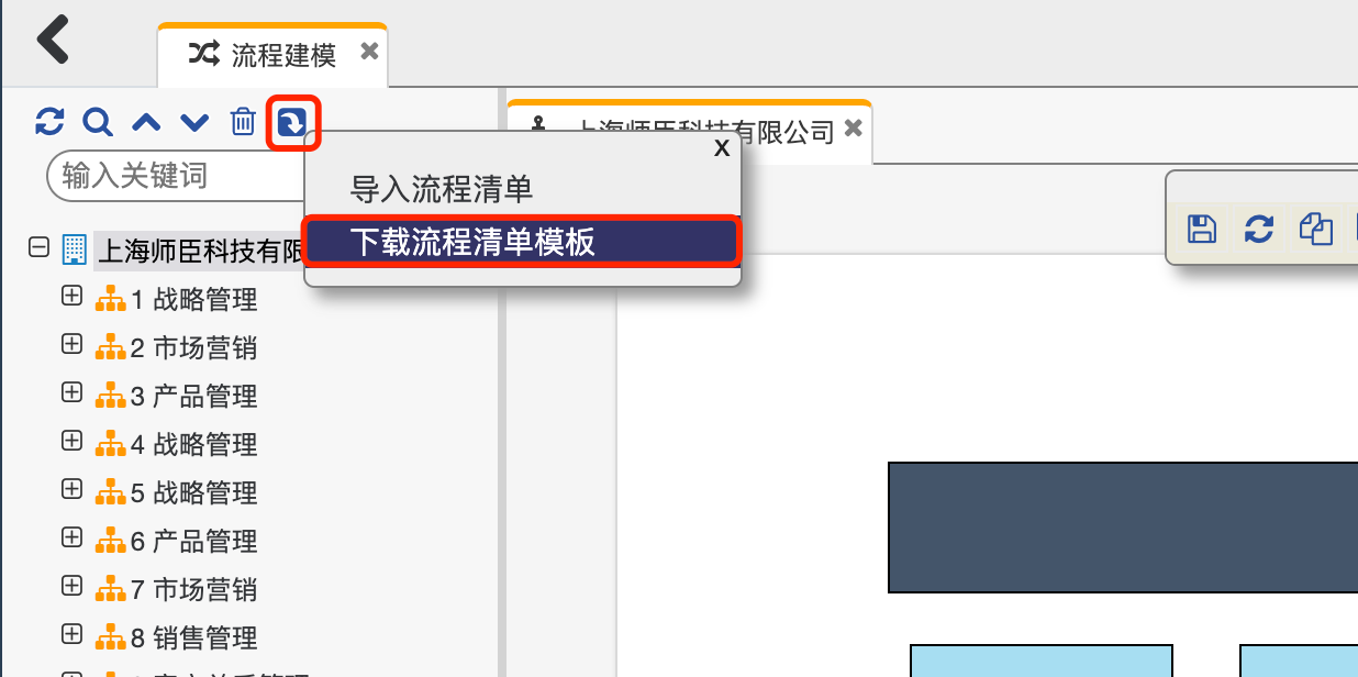 点击流程目录树上方导入按钮,在弹出的菜单中选择现在流程清单模板。