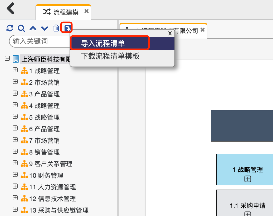 点击流程目录树上方导入按钮,在弹出的窗口中选择“导入流程清单”。