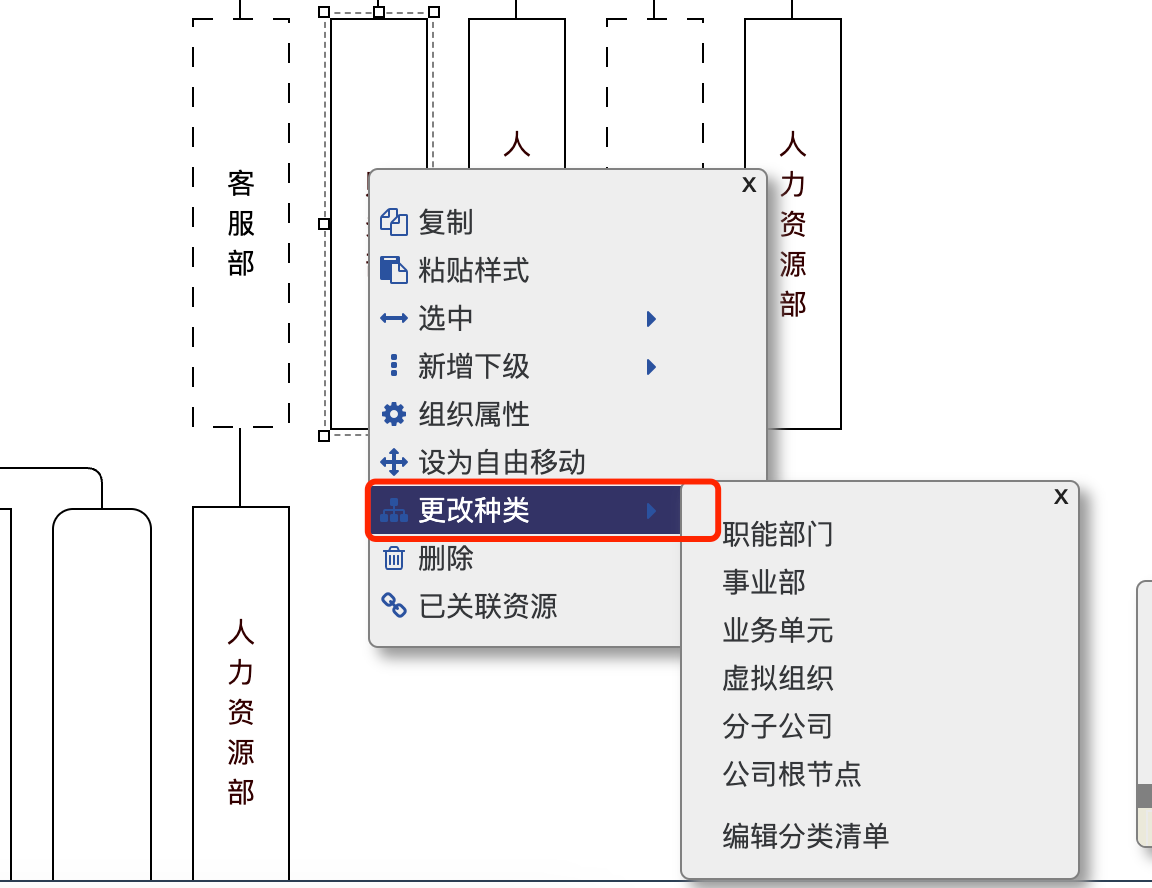 第一步:右键组织架构上任意节点,选择“更改种类”,在弹出的列表中选择需要修改的组织类型即可。