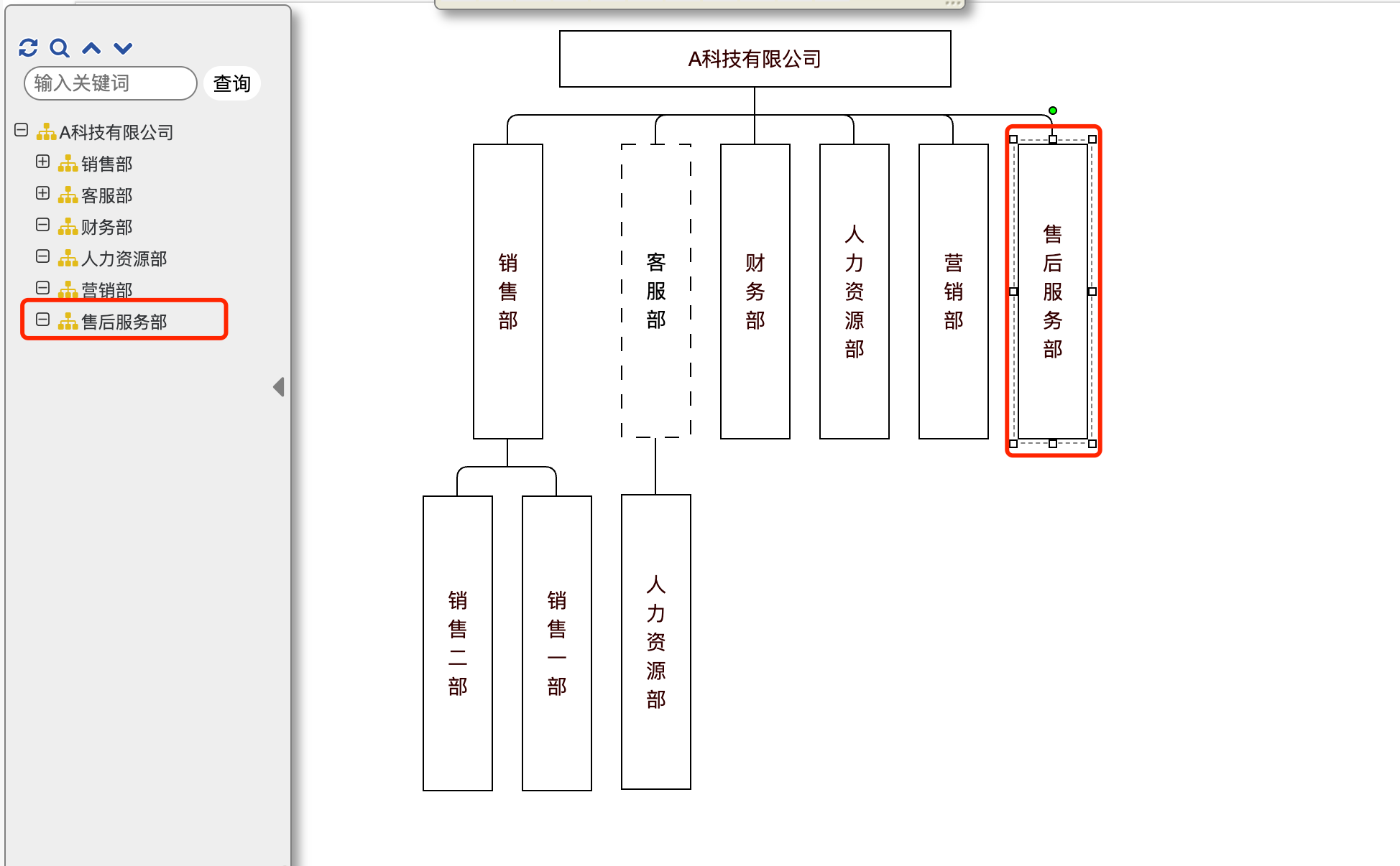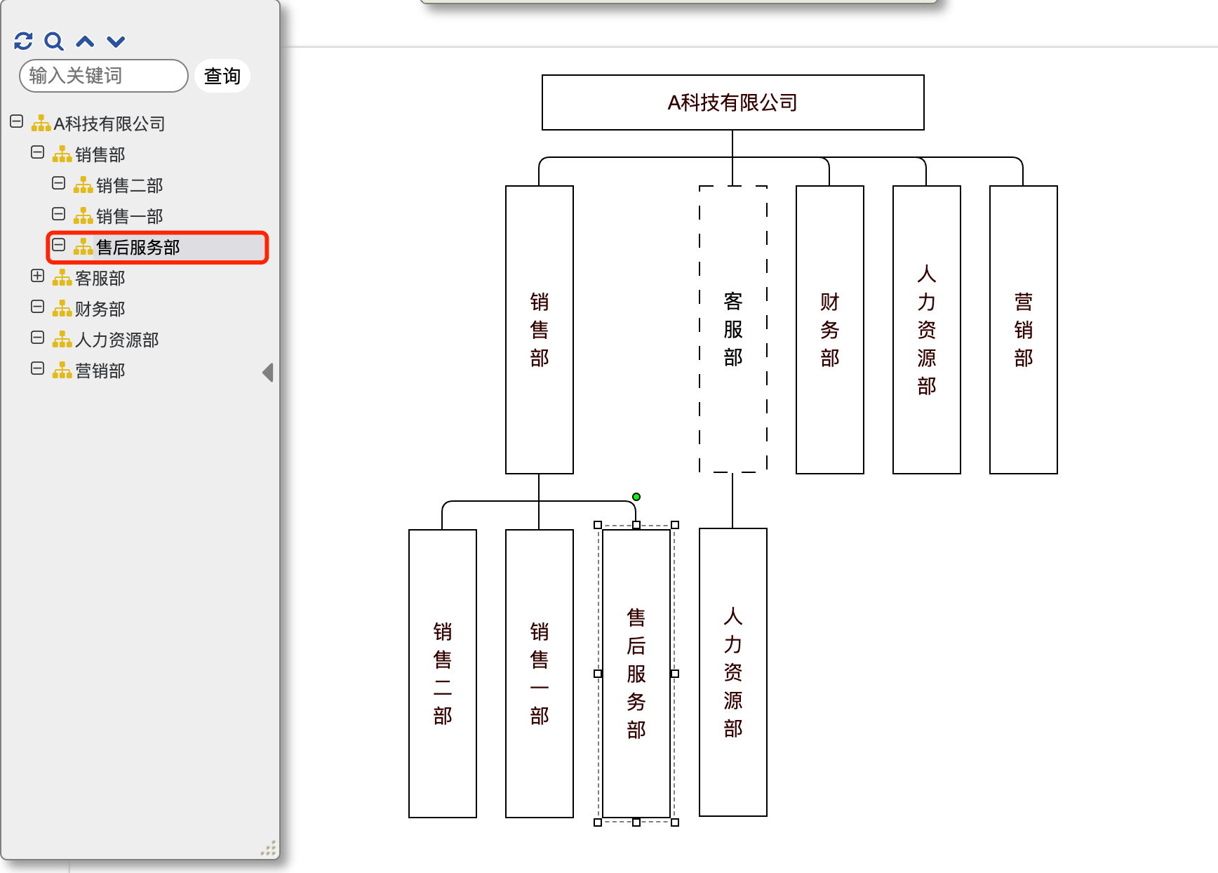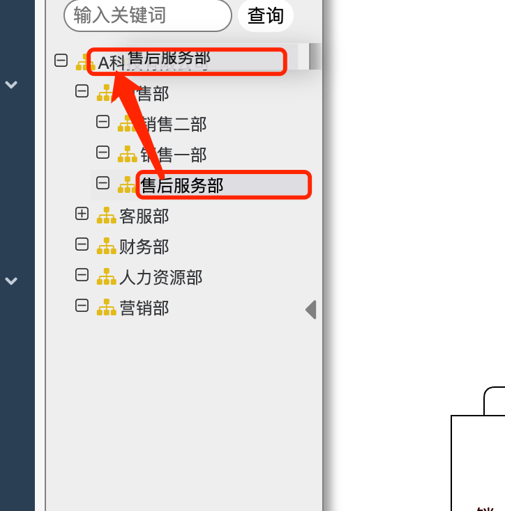 第二步:鼠标左键拖动该组织不放,直至将该部门拖至所在的目标组织处。如在本案例中,需要将“售后服务部”调整为一级职能部门,即“A科技有限公司”的一级职能部门,仅需将“售后服务部”拖动至“A科技有限公司”处即可。