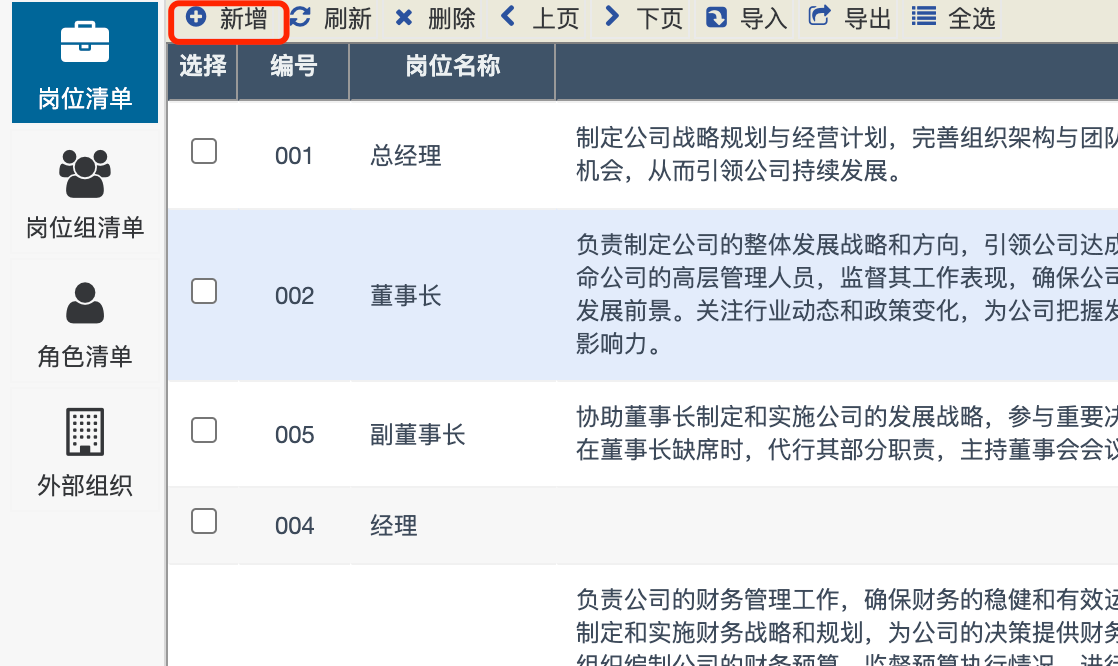 在“组织管理->岗位与角色-岗位清单”模块中完成岗位的增加。