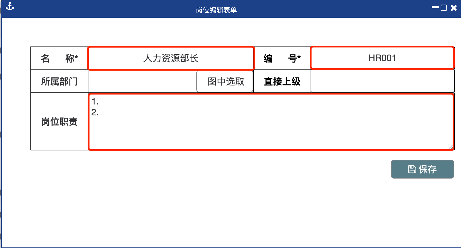 第二步:在弹出的窗口内录入“名称”、“编号”、“岗位职责”。
