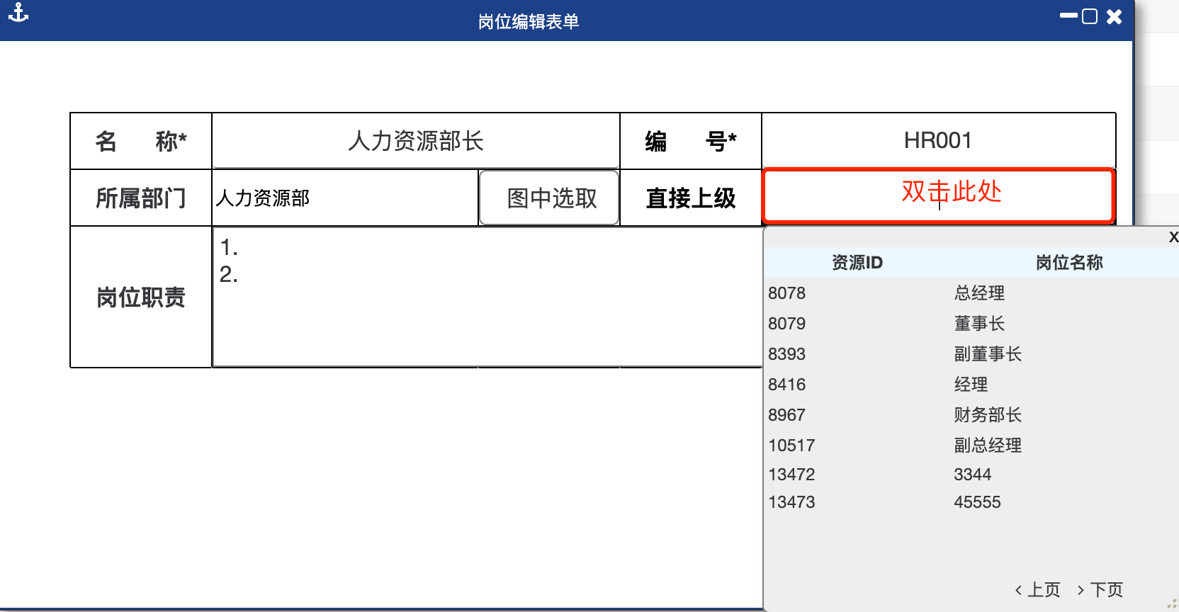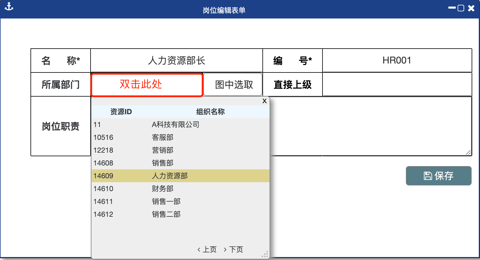 第三步:双击“所属部门”栏,在弹出的列表中选择该岗位所在组织。