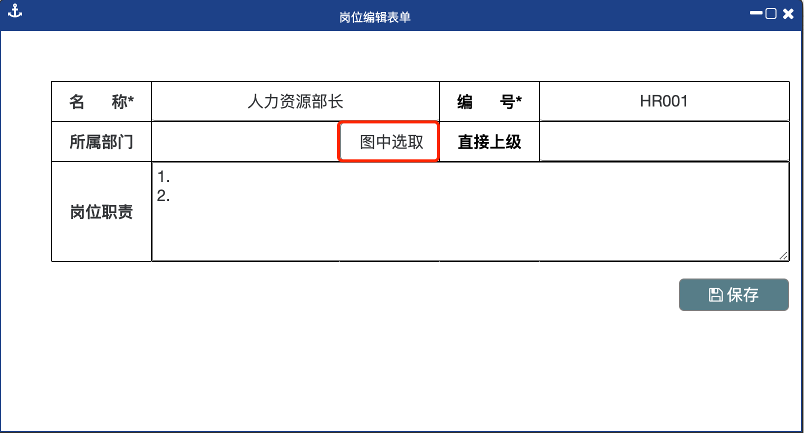 或者点击该栏的“图中选取”按钮,在弹出的窗口中单击选择该岗位所在组织,然后点击确认。