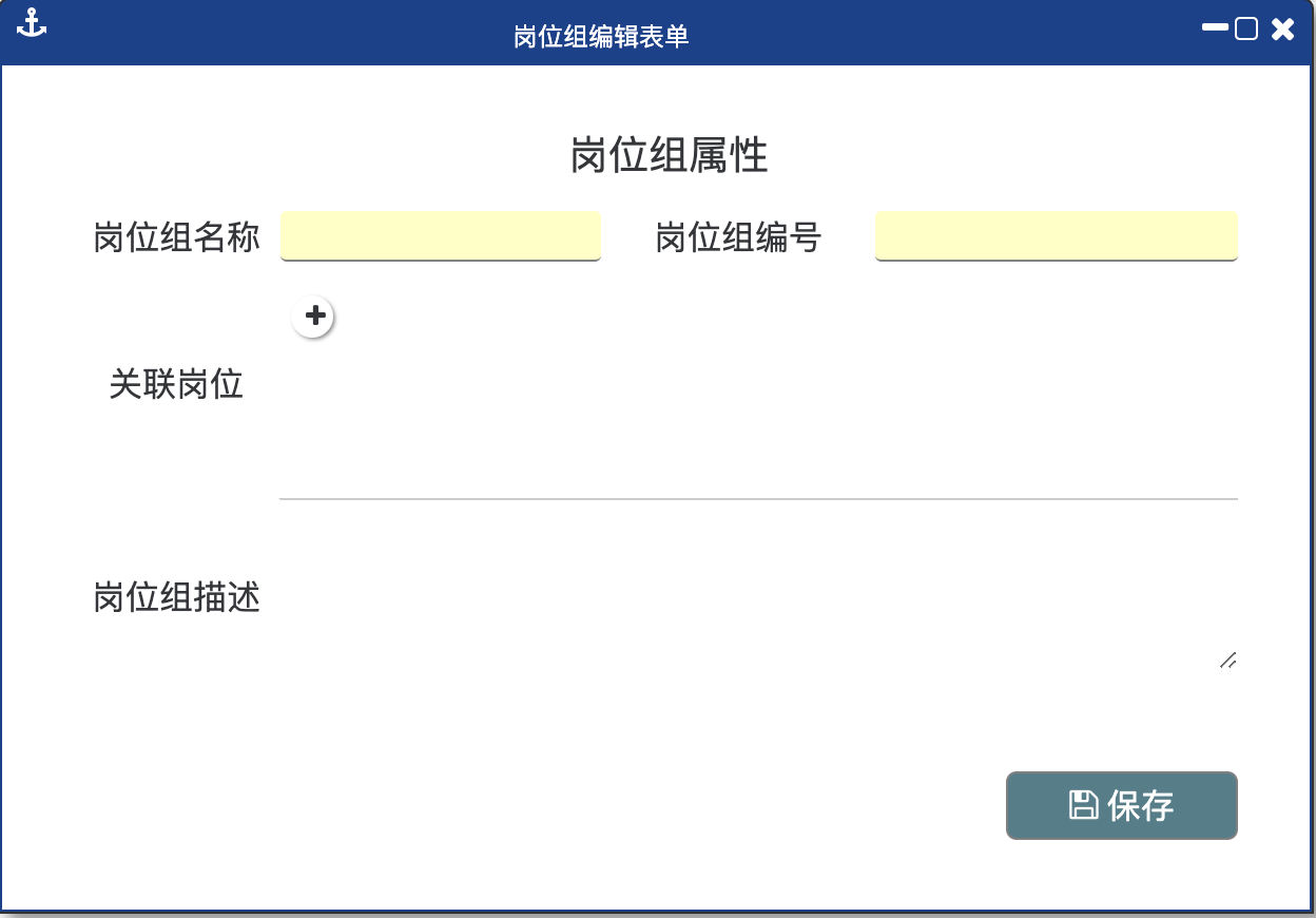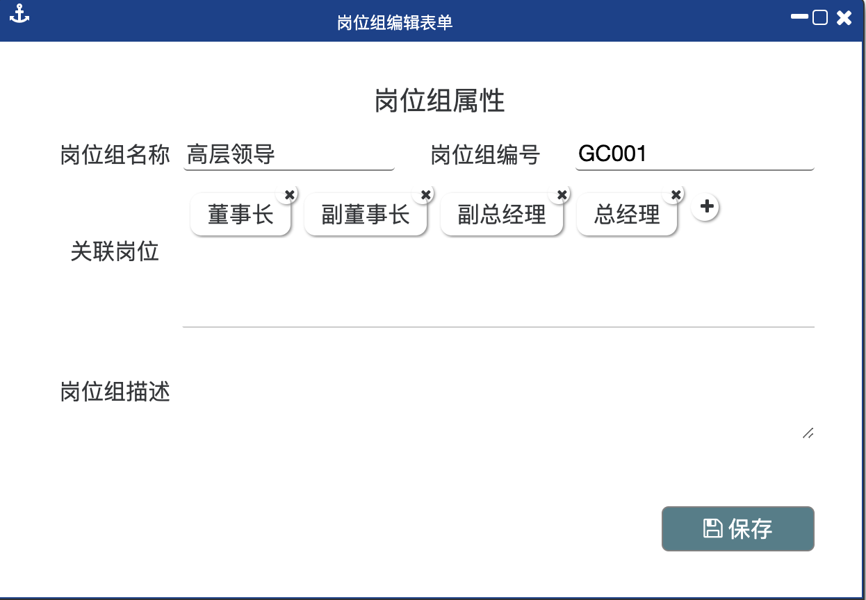 第二步:在弹出的窗口内录入“岗位组名称、岗位组编号、岗位组描述”。