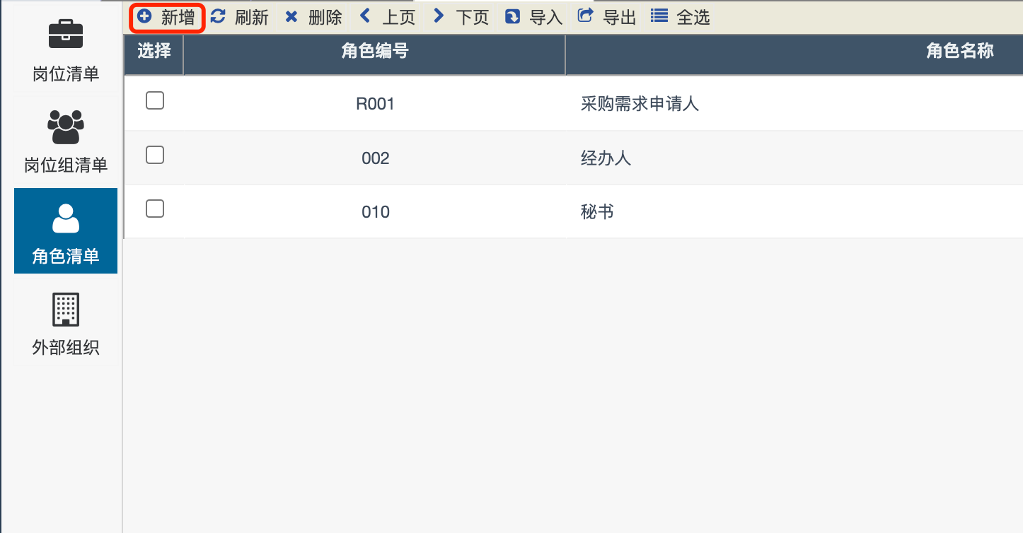 在“组织管理->岗位与角色-角色清单”模块中完成通用角色的增加。