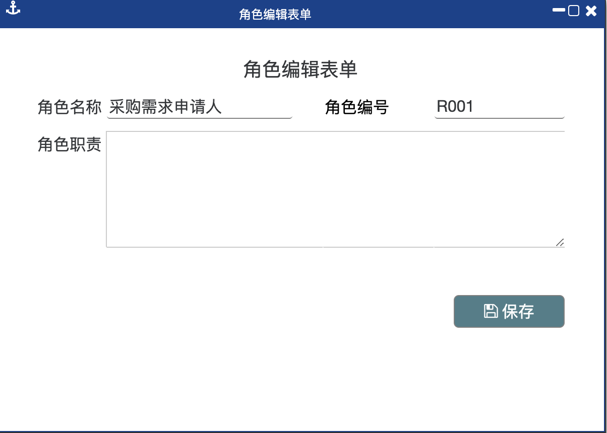 第二步:录入角色基本信息。在弹出的窗口中录入角色名称、角色编号、角色职责基本信息,然后点击“保存”即可。