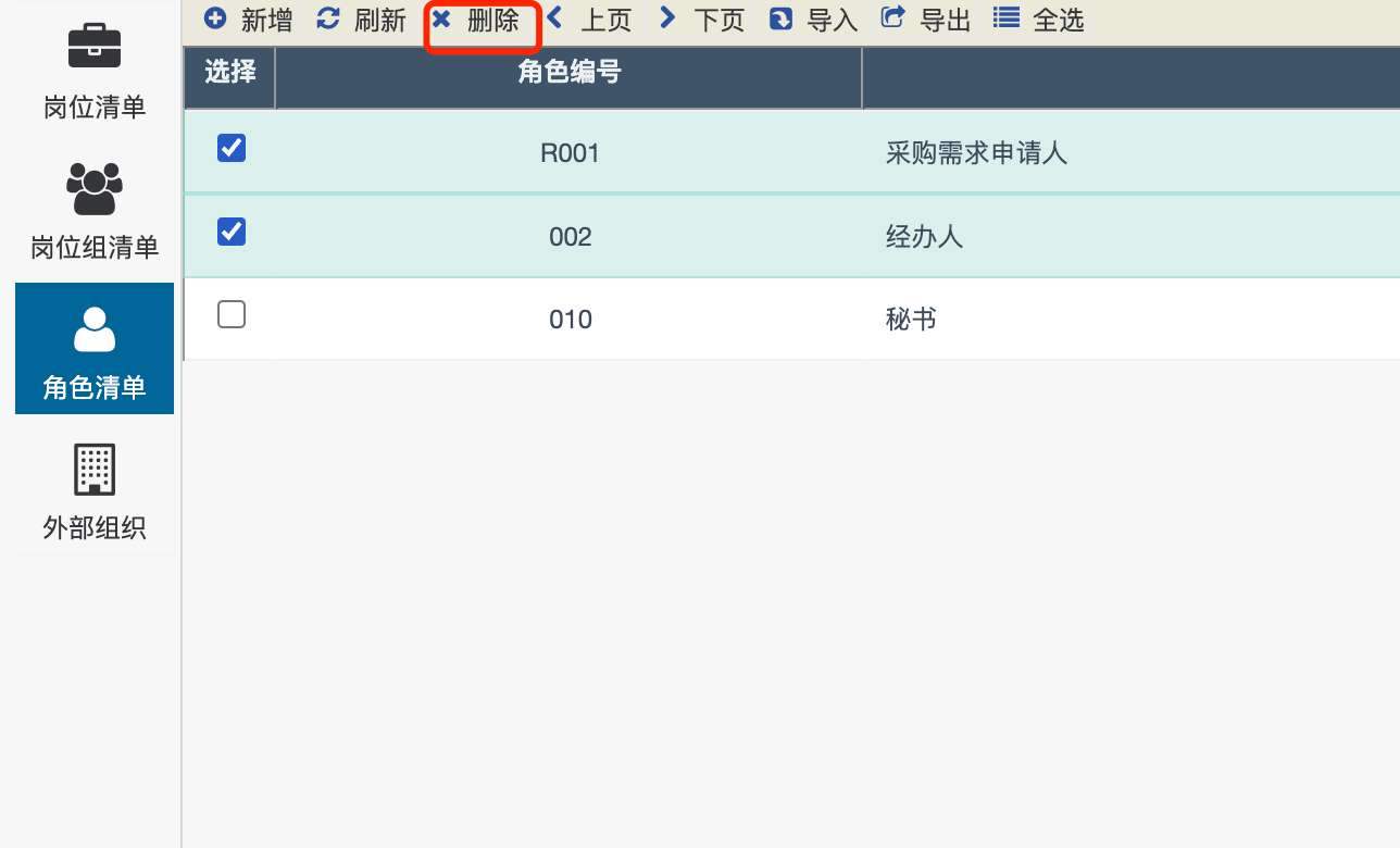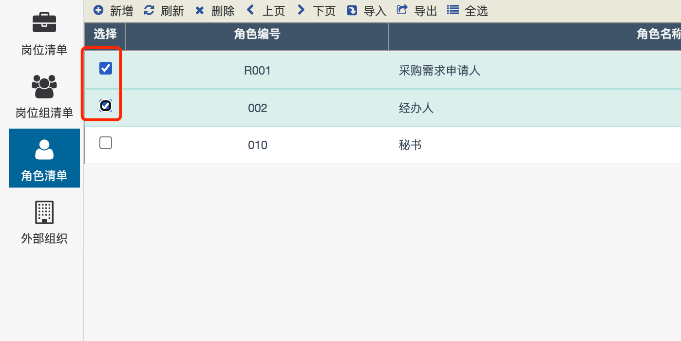 第一步:选择需要删除的通用角色。在角色清单界面,点击需要删除的通用角色前的复选框。